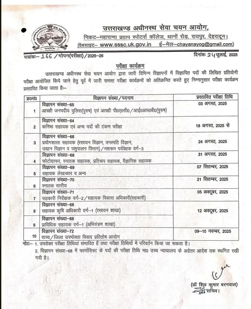 उत्तराखण्ड अधीनस्थ सेवा चयन आयोग द्वारा जारी विभिन्न विज्ञापनों में विज्ञापित पदों की लिखित प्रतियोगी परीक्षा आयोजित किये जाने हेतु पूर्व में जारी समस्त परीक्षा कार्यक्रमों को अतिक्रमित करते हुए निम्नानुसार परीक्षा कार्यक्रम प्रस्तावित किया जाता है:-