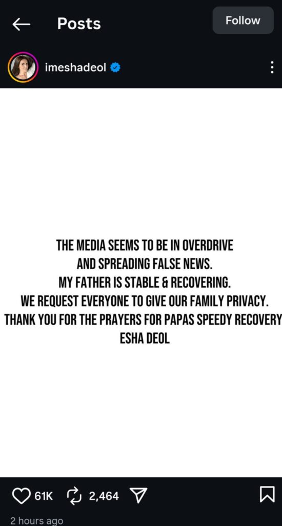 ईशा देओल ने अपने पोस्ट में लिखा — “प्लीज़ अफवाहों पर ध्यान न दें, पापा बिल्कुल ठीक हैं।”