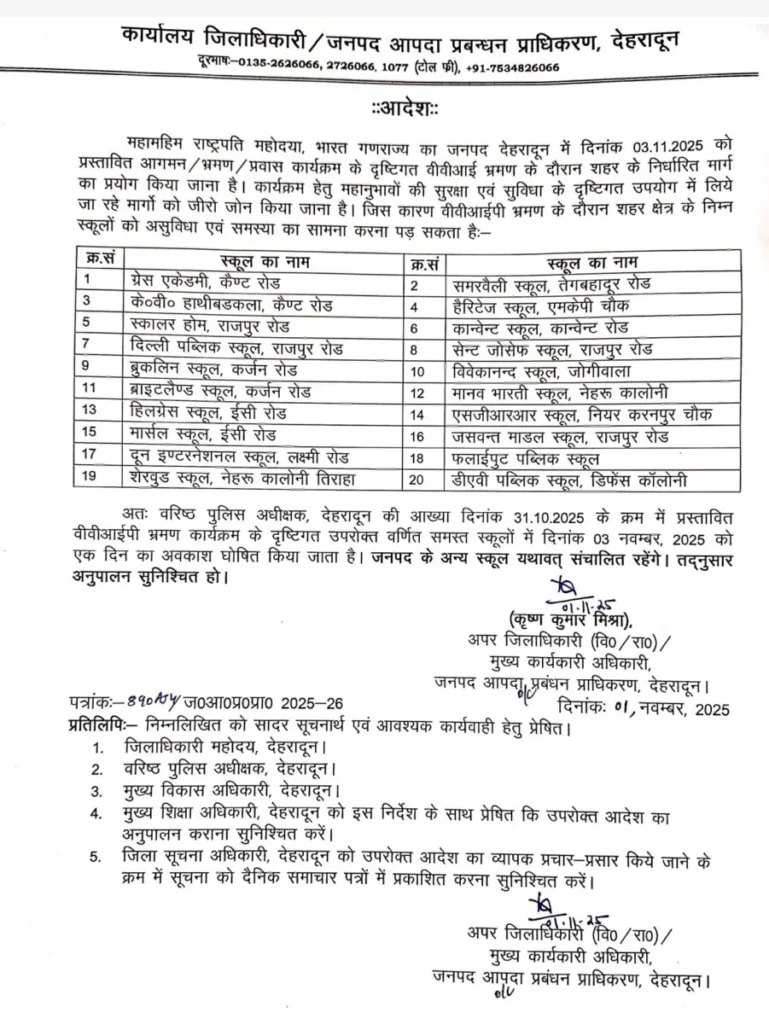 वरिष्ठ पुलिस अधीक्षक, देहरादून की आख्या दिनांक 31.10.2025 के क्रम में प्रस्तावित वीवीआईपी भ्रमण कार्यक्रम के दृष्टिगत उपरोक्त वर्णित समस्त स्कूलों में दिनांक 03 नवम्बर, 2025 को एक दिन का अवकाश घोषित किया जाता है। जनपद के अन्य स्कूल यथावत् संचालित रहेंगे। तद्नुसार अनुपालन सुनिश्चित हो।