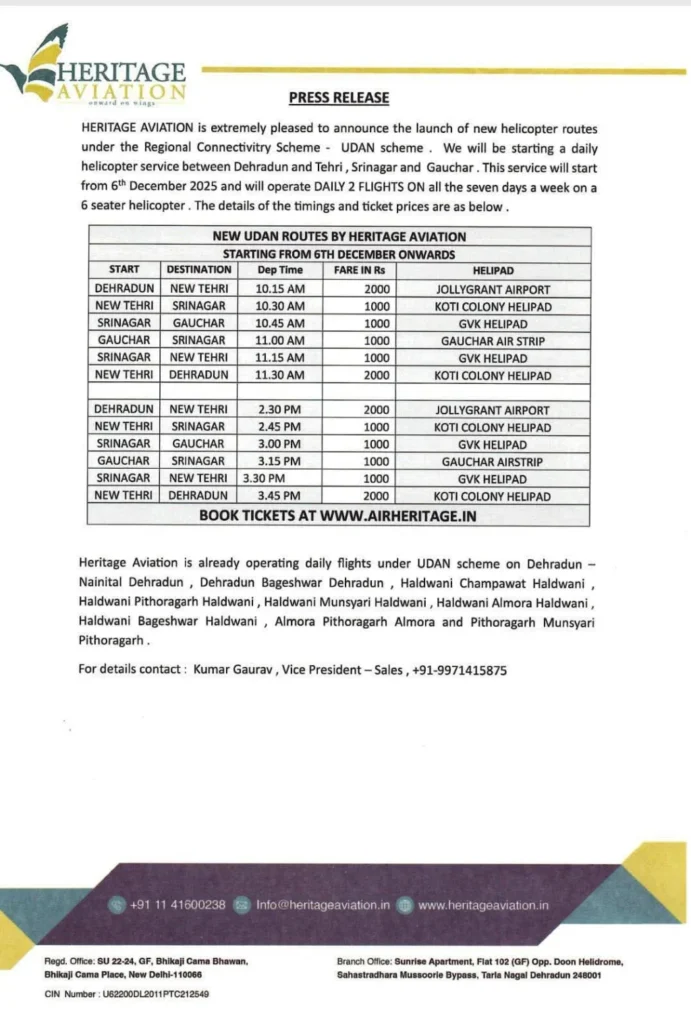 एक बार फिर देहरादून से गोचर चमोली तक टिहरी, श्रीनगर उड़ान योजना के तहत हेरिटेज एविएशन (HERITAGE AVIATION) की हेली सेवा कल 6 दिसंबर से शुरू हो रही है। लंबे समय से बंद होने से इमरजेंसी जाने वालों को दिक्कत का सामना करना पड़ रहा था सेवा फिर शुरू होने से लोगों को आसान यात्रा ओर सस्ते में हवाई सेवा का अवसर मिलेगा खासकर इमरजेंसी में जाने वालों के लिए बहुत ही फायदेमंद प्रतिदिन दो बार सुबह और शाम में हेली सेवा चलेगी।टिकट बुक करने के लिए BOOK TICKETS AT WWW.AIRHERITAGE.IN साईट पर जाकर कर सकते हैं।
