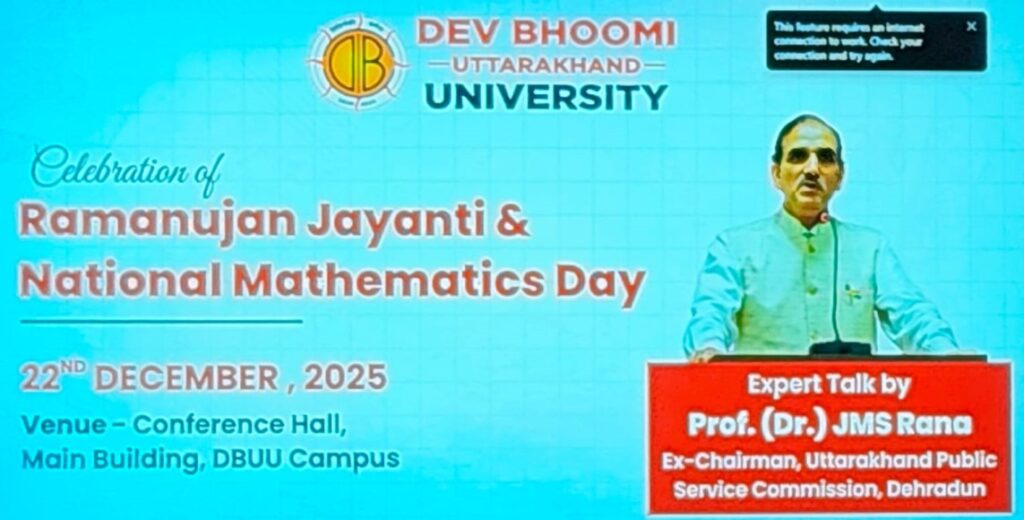 22 December: देव भूमि उत्तराखंड विश्वविद्यालय, देहरादून में राष्ट्रीय गणित दिवस के अवसर पर एक गरिमामय एवं बौद्धिक कार्यक्रम का आयोजन किया गया। राष्ट्रीय गणित दिवस हर साल 22 दिसंबर को मनाया जाता है। यह दिन महान गणितज्ञ श्रीनिवास रामानुजन की जयंती के रूप में मनाया जाता है और इसका उद्देश्य गणित के महत्व को समाज तथा शिक्षा के क्षेत्र में रेखांकित करना है।