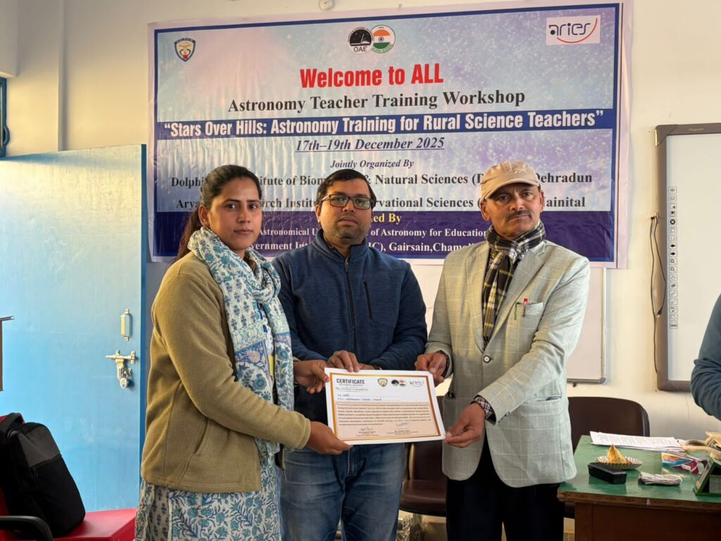 डॉल्फिन (पीजी) इंस्टीट्यूट ऑफ बायोमेडिकल एंड नैचुरल साइंसेज (DIBNS), देहरादून एवं आर्यभट्ट प्रेक्षणीय विज्ञान अनुसंधान संस्थान (ARIES), नैनीताल द्वारा संयुक्त रूप से आयोजित तीन दिवसीय खगोल विज्ञान शिक्षक प्रशिक्षण कार्यशाला “Stars Over Hills: ग्रामीण विज्ञान शिक्षकों हेतु खगोल प्रशिक्षण” का शुक्रवार को राजकीय इंटर कॉलेज, गैरसैंण में सफल समापन हो गया। इस कार्यशाला को अंतरराष्ट्रीय खगोल संघ (IAU) – ऑफिस ऑफ एस्ट्रोनॉमी फॉर एजुकेशन (OAE) का सहयोग प्राप्त रहा।