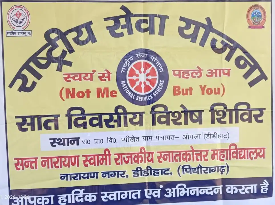 डीडीहाट (21 फरवरी 2026) | ग्राम पंचायत ओगला, डीडीहाट में राष्ट्रीय सेवा योजना (एनएसएस) के तत्वावधान में आयोजित सात दिवसीय आवासीय विशेष शिविर का शुक्रवार को उत्साहपूर्ण एवं गरिमामय वातावरण में शुभारंभ हुआ। कार्यक्रम की मुख्य अतिथि प्राचार्य प्रोफेसर प्रेमलता कुमारी ने दीप प्रज्वलन कर शिविर का विधिवत उद्घाटन किया।